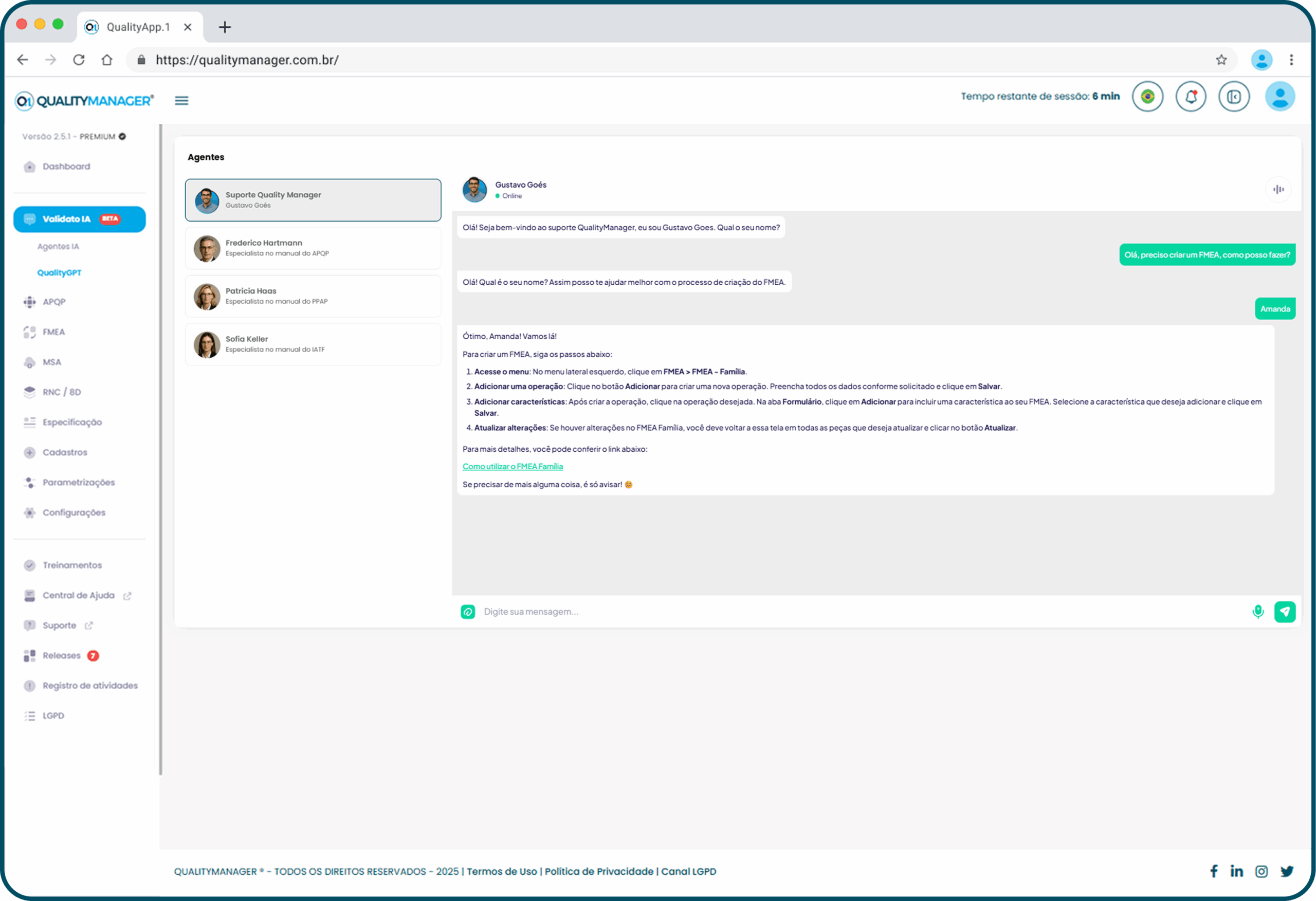 O QualityGPT atua como um verdadeiro consultor digital dentro da plataforma. Ele é capaz de responder dúvidas técnicas sobre ferramentas da qualidade como FMEA, APQP, MSA, CEP e 8D, além de interpretar corretamente os requisitos das normas da IATF 16949.